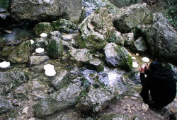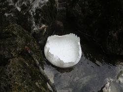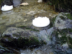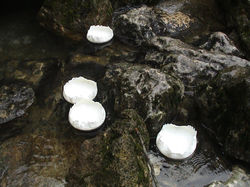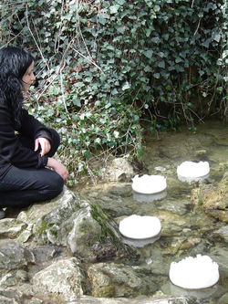 Instalación efímera de diez piezas flotantes realizadas en porcelana translúcida, colocada en el Nacedero del Río Urederra, Navarra